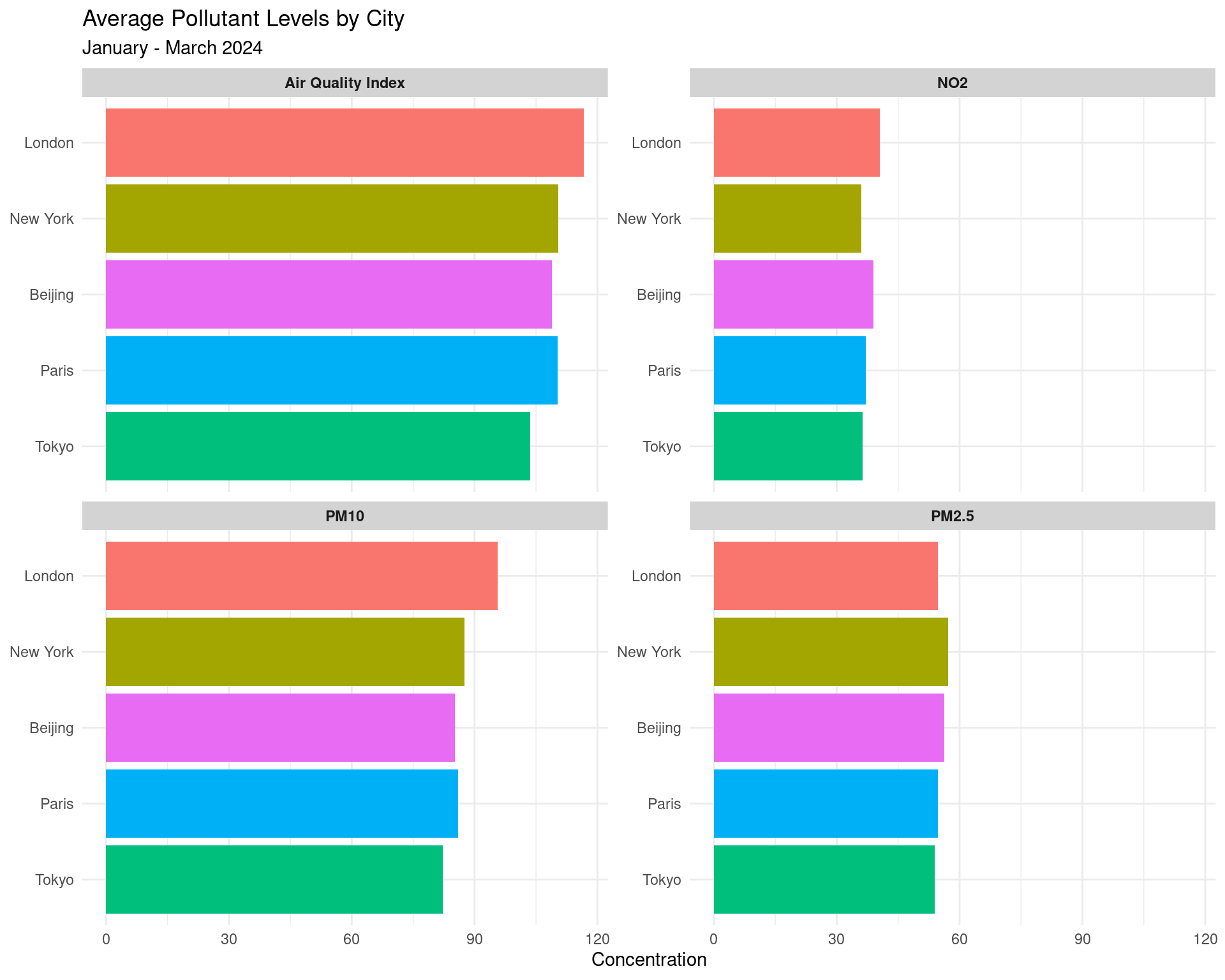 Let’s compare the different pollutant levels across cities: